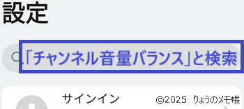 もし機種が違うなどで当該箇所にたどり着かない場合は、設定の下にある検索バーで「チャンネル音量バランス」と検索すると当該箇所が出ます。